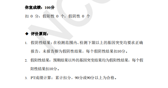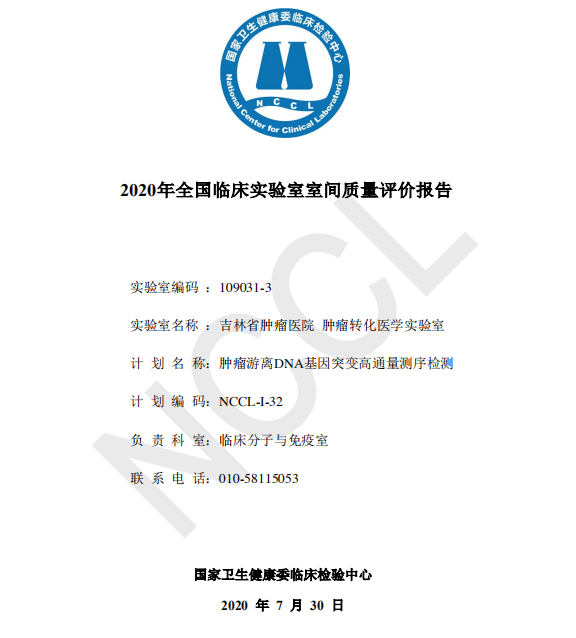 8月6日,国家卫生健康委临床检验中心公布了全国临床实验室“肿瘤游离DNA基因突变高通量测序检测”室间质量评价报告,我院肿瘤转化医学实验室再次斩获100分!国家卫生健康委临床检验中心(NCCL)室间质量评价(EQA,external quality assessment)是我国卫生行政主管部门对实验室质量实施监督的重要工具。此次我院实验室满分通过,也代表着检测能力再次得到国家权威机构的充分认可。