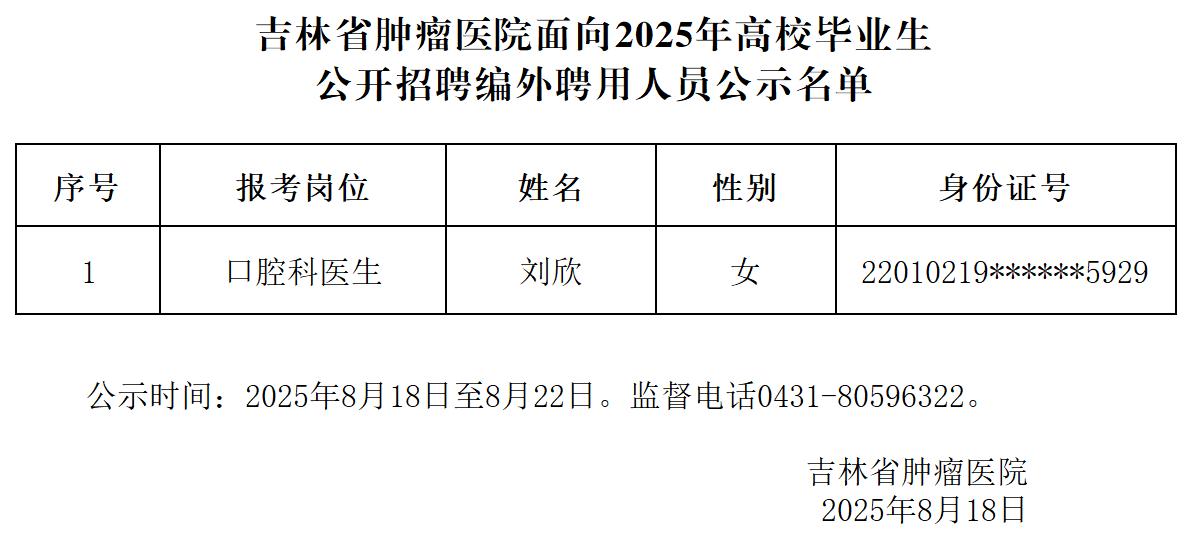 吉林省肿瘤医院面向2025年高校毕业生公开招聘编外聘用人员公示名单