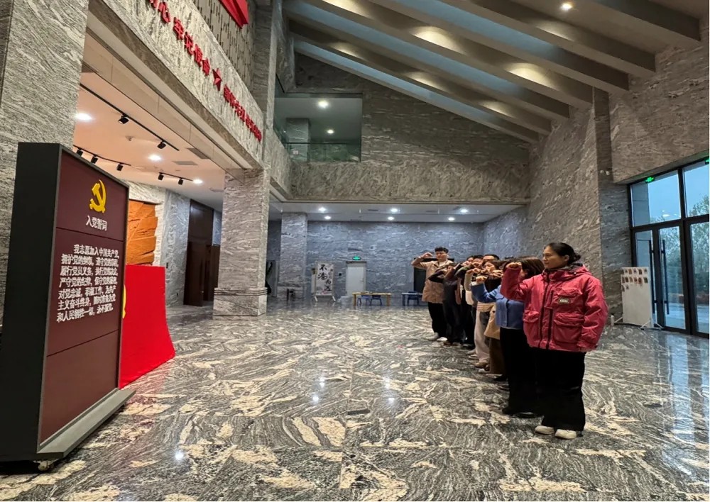 在教育基地宣誓广场,全体党员面向鲜红党旗,举起右拳庄严宣誓,重温入党誓词。铿锵有力的誓言回荡其间,既是对革命先辈的深切缅怀,更坚定了党员们牢记身份、践行初心使命的信念。