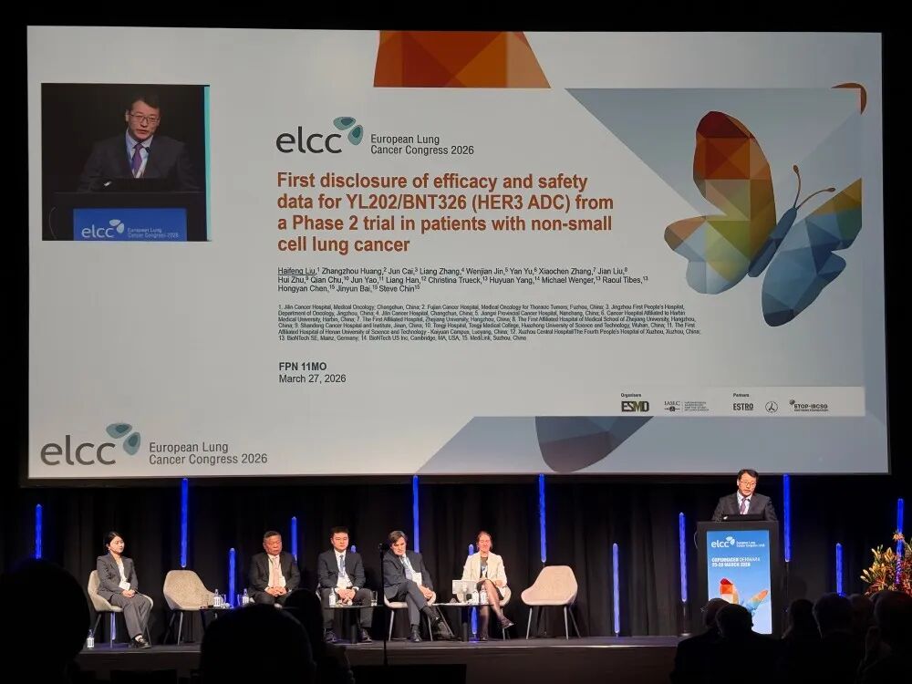 2026年欧洲肺癌大会(ELCC)于3月25日至28日在丹麦哥本哈根盛大召开。作为胸部肿瘤学领域的国际顶级盛会,ELCC汇聚了全球前沿的科研成果与临床智慧。在本届大会上,来自中国的多项研究再次成为焦点,吉林省肿瘤医院刘海峰教授主持开展的一项关于YL202/BNT326的II期临床试验,以口头报告形式首次公布了其在非小细胞肺癌(NSCLC)患者中的疗效与安全性数据。