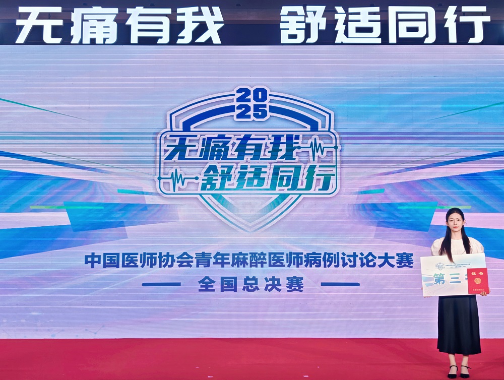 本次大赛是全国麻醉学领域极具影响力的青年医师高水平赛事,汇聚各地麻醉学精英同台竞技。贾秀男以《精准护航:一例累及上腔静脉胸腺瘤切除术的麻醉管理》为参赛病例,在10分钟限时演讲中,系统呈现多学科会诊、精准术前评估的诊疗思路,制定以硬膜外镇痛为主、复合支气管全麻并实施单肺隔离技术的个体化麻醉方案,其科学严谨的麻醉策略与精细化管理理念,获得评审专家组高度认可,最终摘得全国第三名的优异成绩。