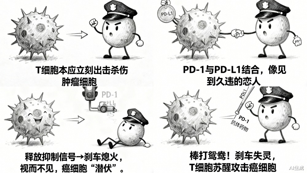 正常情况下,T 细胞见到癌细胞会立刻出击,但一旦 T 细胞的 PD-1 和癌细胞的 PD-L1 “绑定”,癌细胞就会释放抑制信号,让 T 细胞 “刹车熄火”,对癌细胞视而不见。