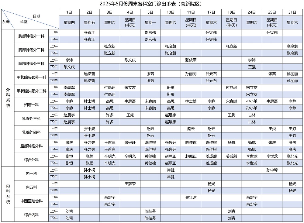 当前位置:首页 > 就医指南 > 专家出诊时间 2025年5月份周末各科室门诊出诊表(仅供参考 以实际出诊情况为准) 来源: 时间:2025-04-24 浏览: 次 2025年5月份周末各科室门诊出诊表(仅供参考 以实际出诊情况为准)来源:吉林省肿瘤医院门诊办公室初审人:陈靖石复审人:贾春祎终审人:梁长林
