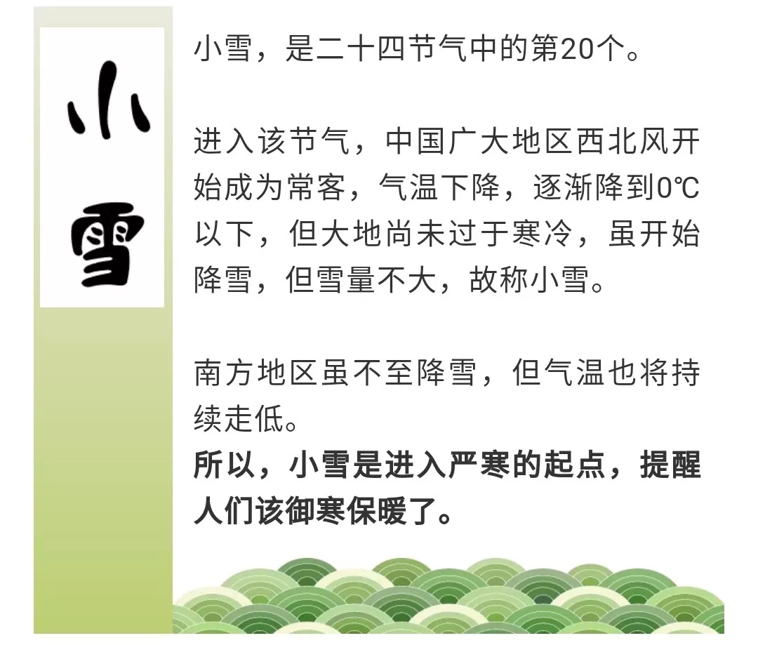 小雪节气后开始进入感冒的高发季节。预防感冒,外出时要加强保暖,尤其是头部、脚部和腹部,多喝水,尤其是梨水和蜜水,加强锻炼、调整膳食、荤素搭配,规律生活,保持个人良好卫生。