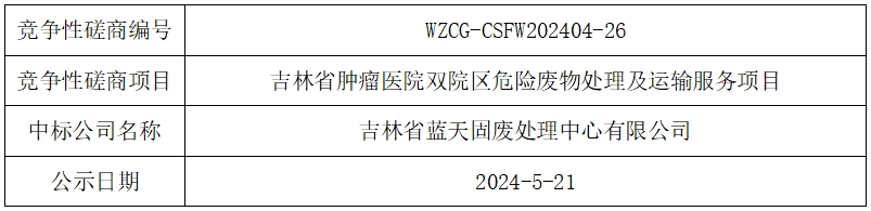 当前位置:首页 > 政务公开 > 公示信息 吉林省肿瘤医院双院区危险废物处理及运输服务中标公示 来源: 时间:2024-05-21 浏览: 次 如有异议请向吉林省肿瘤医院纪检监察室进行投诉。投诉电话:高新院区0431-80596118,0431-80596322;湖光院区0431-85871905。