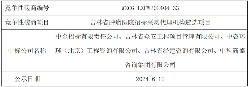 当前位置:首页 > 政务公开 > 公示信息 吉林省肿瘤医院招标采购代理机构遴选项目中标公示 来源: 时间:2024-06-12 浏览: 次 如有异议请向吉林省肿瘤医院纪检监察室进行投诉。投诉电话:高新院区0431-80596118,0431-80596322;湖光院区0431-85871905。