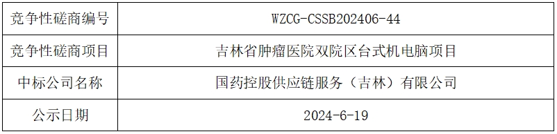 当前位置:首页 > 政务公开 > 公示信息 吉林省肿瘤医院双院区台式机电脑项目中标公示 来源: 时间:2024-06-19 浏览: 次 如有异议请向吉林省肿瘤医院纪检监察室进行投诉。投诉电话:高新院区0431-80596118,0431-80596322;湖光院区0431-85871905。