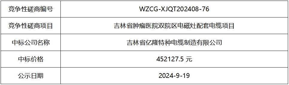 当前位置:首页 > 政务公开 > 公示信息 吉林省肿瘤医院双院区电磁灶配套电缆项目中标公示 来源: 时间:2024-09-19 浏览: 次 如有异议请向吉林省肿瘤医院纪检监察室进行投诉。投诉电话:高新院区0431-80596118,0431-80596322;湖光院区0431-85871905