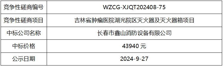 当前位置:首页 > 政务公开 > 公示信息 吉林省肿瘤医院湖光院区灭火器及灭火器箱项目中标公示 来源: 时间:2024-09-27 浏览: 次 如有异议请向吉林省肿瘤医院纪检监察室进行投诉。投诉电话:高新院区0431-80596118,0431-80596322;湖光院区0431-85871905。