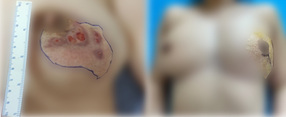 术后,乳腺外二科主任徐贵颖指出,对于非结核性棒状杆菌感染的浆细胞乳腺炎,抗生素类药物治疗往往无效,这类乳腺炎易复发、易窦道形成皮肤破损、迁延不愈,该病例经过抗结核治疗后取得良好疗效,值得关注;手术范围要求切除原破损皮肤、病灶所在象限、乳头乳晕下腺体组织,动员外侧、及外上腺体组织瓣修补残腔;切除范围过大,导致乳腺组织缺损严重,常规切除方法必定会影响愈后乳房美学效果;通过应用V型切口+外侧腺体组织瓣旋转备乳头乳晕复合体重新定位修复大范围(>25%)组织量缺损的II型整形技术,为我们科室肿瘤整形保乳手术个体化的方案设计提供了进一步探索,值得尝试和推广。