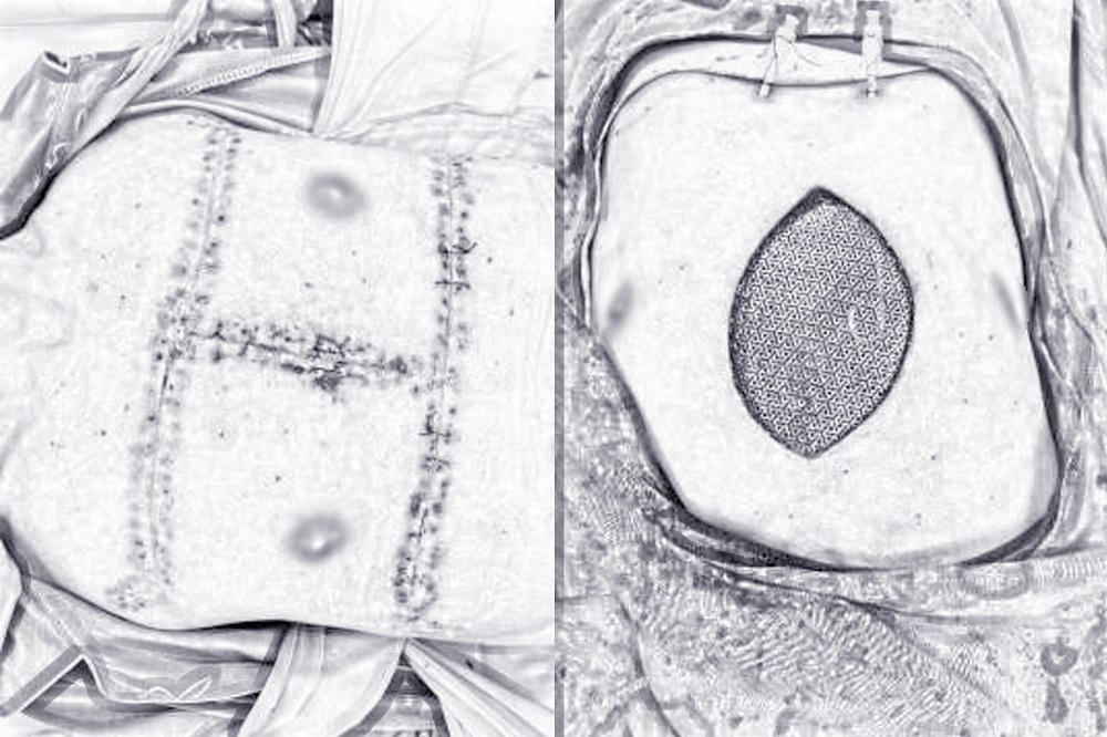 手术过程中,肿瘤完整切除后术后病理报告显示符合高分化软骨肉瘤,术中冰冻病理证实切缘阴性,李航团队随即应用颅骨钛网重建骨性胸壁,测量缺损面积(16*15厘米),钢丝固定,人工型游离双侧筋膜皮瓣,注意保护皮瓣血运,推移缝合后,皮瓣颜色正常,加压包扎,右侧胸腔及创口内置入负压引流。手术过程顺利,患者术后两周康复出院。