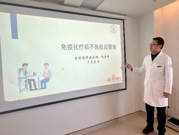 随后,主治医师于昊通过“免疫化疗后不良反应管理”的主题分享。凭借丰富的临床经验,详细讲解了免疫化疗后可能出现的各种不良反应并针对不同的症状给出了具体的应对措施和护理建议,让患者和家属对后续治疗过程中的不良反应有了更清晰的认识和应对方法。