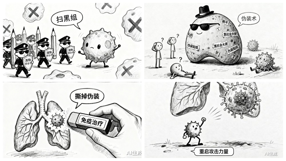 可以把免疫 T 细胞想象成体内的 “扫黑组”,本职就是清除癌细胞这类 “坏分子”。但肺癌这个 “黑老大” 很狡猾,会搞 “伪装术”,让 “扫黑组” 认不出它,甚至让 “扫黑组” 直接 “躺平”。