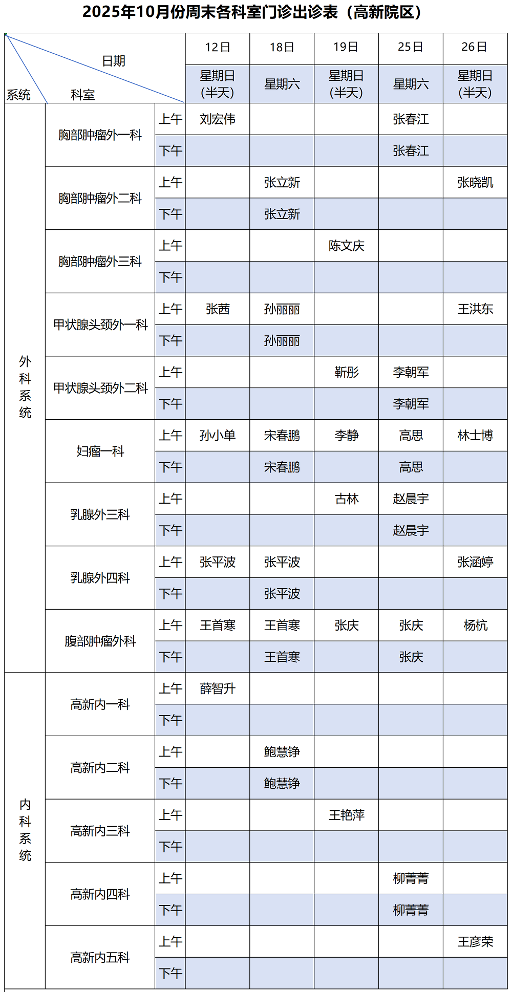 当前位置:首页 > 就医指南 > 专家出诊时间 吉林省肿瘤医院2025年10月份周末各科室门诊出诊表(仅供参考 以实际出诊情况为准) 来源: 时间:2025-10-10 浏览: 次 2025年10月份周末各科室门诊出诊表(仅供参考 以实际出诊情况为准)来源:吉林省肿瘤医院门诊办公室初审人:陈靖石复审人:贾春祎终审人:梁长林